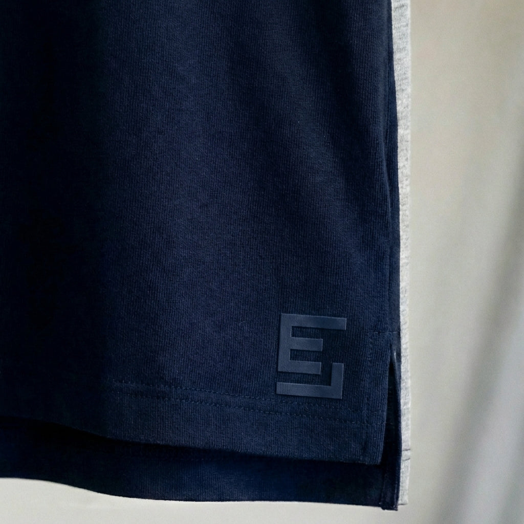 We took a different approach. Every Essential Layers piece carries just one mark — a small, tonal 'E' near the lower hem. Tone-on-tone, designed to blend with the fabric rather than contrast against it.